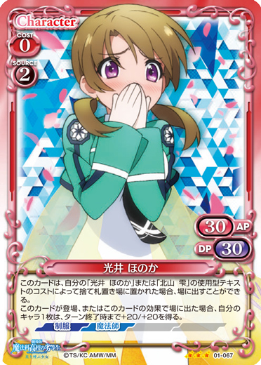 | このカードは、自分の「光井 ほのか」または「北山 雫」の使用型テキストのコストによって捨て札置き場に置かれた場合、場に出すことができる。このカードが登場、またはこのカードの効果で場に出た場合、自分のキャラ1枚は、ターン終了時まで+20/+20を得る。 | ||