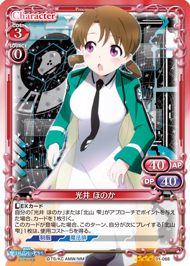 | 〔EXカード〕自分の「光井 ほのか」または「北山 雫」がアプローチでポイントを与えた場合、カードを1枚引く。このカードが登場した場合、このターン、自分が次にプレイする「北山 雫」1枚は、使用コスト-5を得る。 | ||