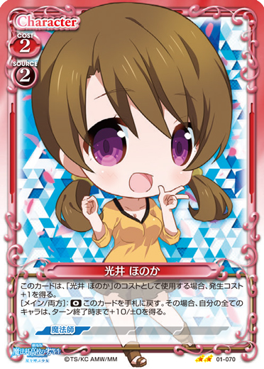 | このカードは、「光井 ほのか」のコストとして使用する場合、発生コスト+1を得る。[メイン/両方]:《0》このカードを手札に戻す。その場合、自分の全てのキャラは、ターン終了時まで+10/±0を得る。 | ||