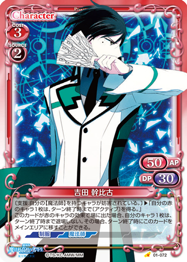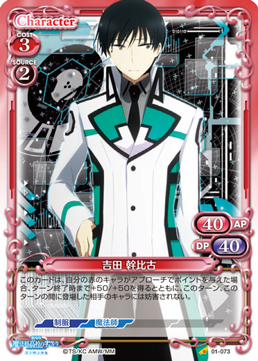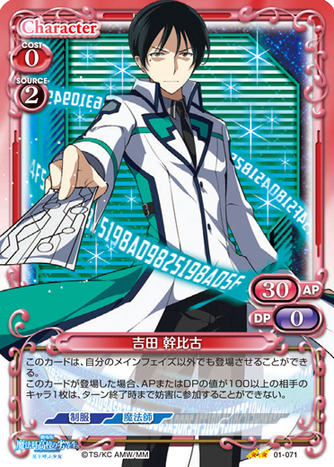 | このカードは、自分のメインフェイズ以外でも登場させることができる。このカードが登場した場合、APまたはDPの値が100以上の相手のキャラ1枚は、ターン終了時まで妨害に参加することができない。 | ||