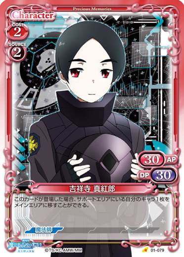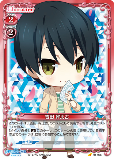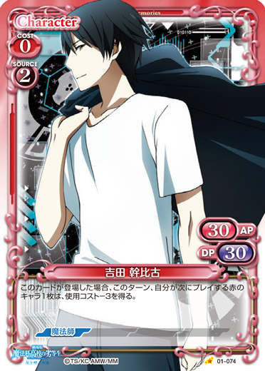 | このカードは、「吉田 幹比古」のコストとして使用する場合、発生コスト+1を得る。[メイン/自分]:《3》このターン、このターンの間に登場している相手の全てのキャラは、妨害に参加することができない。 | ||