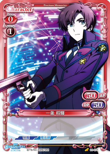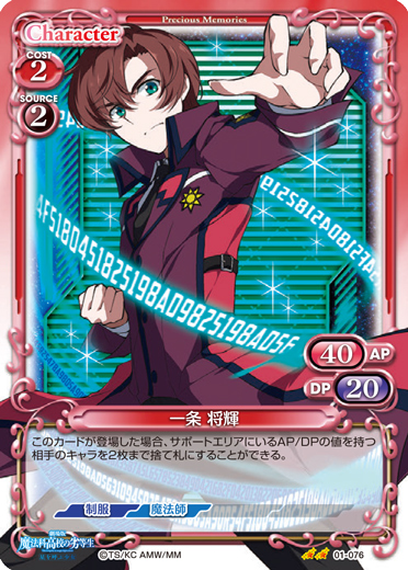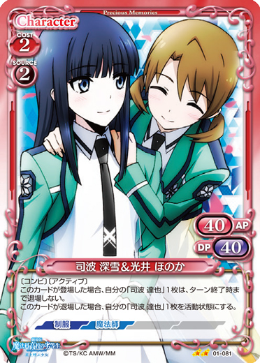 | 〔コンビ〕〔アクティブ〕このカードが登場した場合、自分の「司波 達也」1枚は、ターン終了時まで退場しない。このカードが退場した場合、自分の「司波 達也」1枚を活動状態にする。 | ||