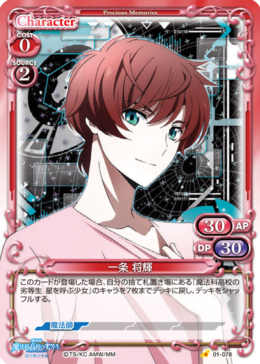 | このカードが登場した場合、自分の捨て札置き場にある『魔法科高校の劣等生 星を呼ぶ少女』のキャラを7枚までデッキに戻し、デッキをシャッフルする。 | ||