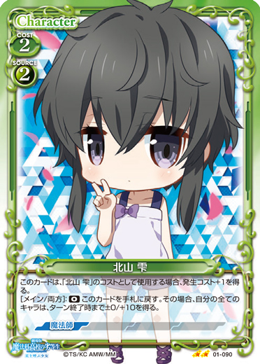 | このカードは、「北山 雫」のコストとして使用する場合、発生コスト+1を得る。[メイン/両方]:《0》このカードを手札に戻す。その場合、自分の全てのキャラは、ターン終了時まで±0/+10を得る。 | ||