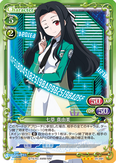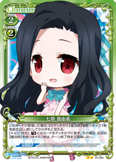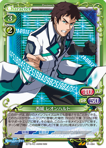 | このカードが登場した場合、EXデッキから【魔法師】を持つキャラ1枚を抜き出し、表にしてから手札に加える。[メイン/自分]:《休》このカードをデッキの下に移す。その場合、自分の【魔法師】を持つキャラ1枚は、ターン終了時まで退場しない。 | ||