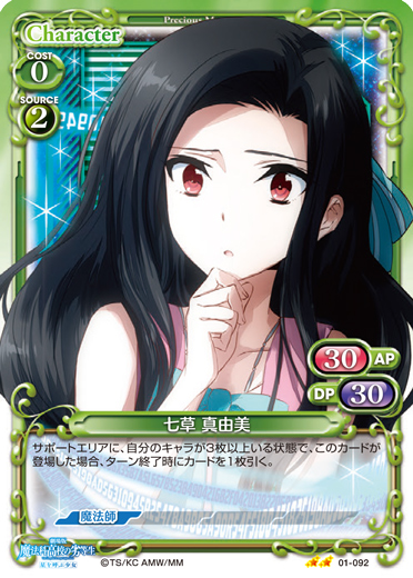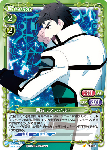 | 〔支援:自分の【魔法師】を持つキャラがアプローチに参加している。〕>「このターンの間に登場している相手のキャラ1枚は、このターン、妨害に参加することができない。」このカードが登場した場合、自分のキャラ1枚は、ターン終了時まで±0/+30を得る。 | ||