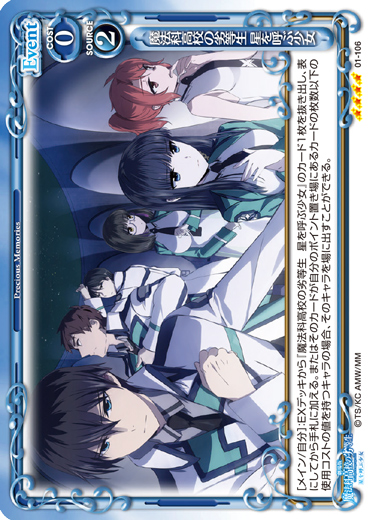 | [メイン/自分]:EXデッキから『魔法科高校の劣等生 星を呼ぶ少女』のカード1枚を抜き出し、表にしてから手札に加える。またはそのカードが自分のポイント置き場にあるカードの枚数以下の使用コストの値を持つキャラの場合、そのキャラを場に出すことができる。 | ||
