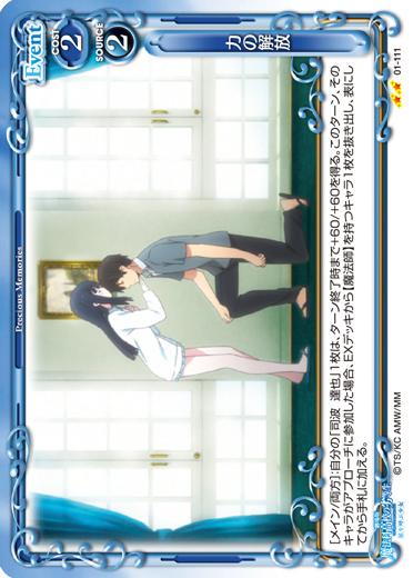 | [メイン/両方]:自分の「司波 達也」1枚は、ターン終了時まで+60/+60を得る。このターン、そのキャラがアプローチに参加した場合、EXデッキから【魔法師】を持つキャラ1枚を抜き出し、表にしてから手札に加える。 | ||