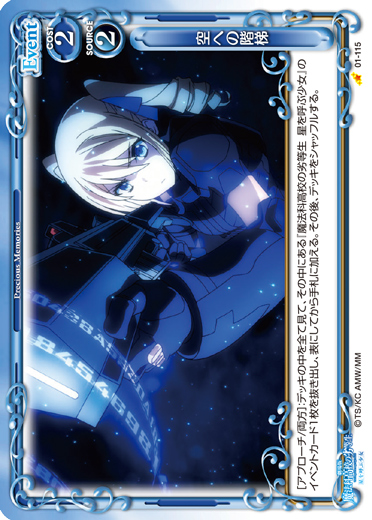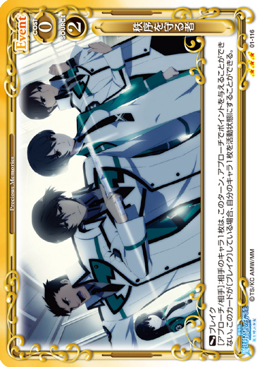 | [アプローチ/両方]:デッキの中を全て見て、その中にある『魔法科高校の劣等生 星を呼ぶ少女』のイベントカード1枚を抜き出し、表にしてから手札に加える。その後、デッキをシャッフルする。 | ||