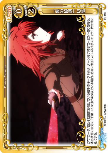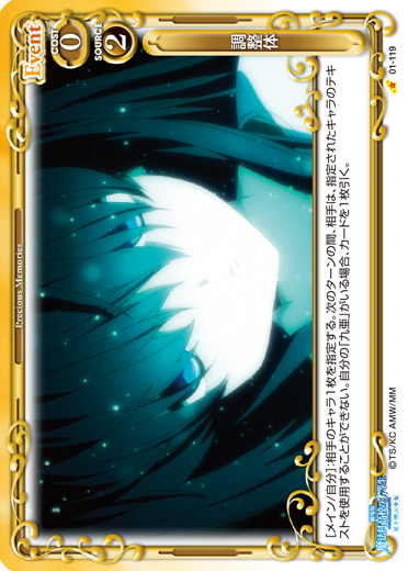 | [メイン/自分]:相手のキャラ1枚を指定する。次のターンの間、相手は、指定されたキャラのテキストを使用することができない。自分の「九亜」がいる場合、カードを1枚引く。 | ||