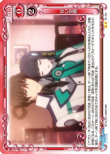 | [アプローチ/自分]:自分の「司波 深雪」1枚は、ターン終了時まで+20/+20を得るとともに、活動状態になる。このターン、自分の「司波 深雪」または「司波 達也」がアプローチでポイントを与えた場合、ターン終了時に自分の全てのキャラを活動状態にする。 | ||