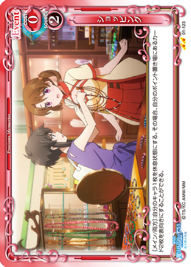 | [メイン/両方]:自分のキャラ1枚を休息状態にする。その場合、自分のポイント置き場にあるカード2枚を表向きにすることができる。 | ||