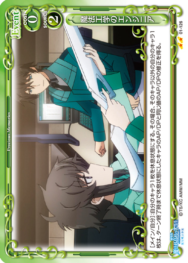 | [メイン/自分]:自分のキャラ1枚を休息状態にする。その場合、そのキャラ以外の自分のキャラ1枚は、ターン終了時まで休息状態にしたキャラのAP/DPと同じ値のAP/DPの修正を得る。 | ||