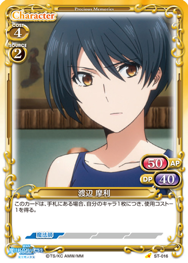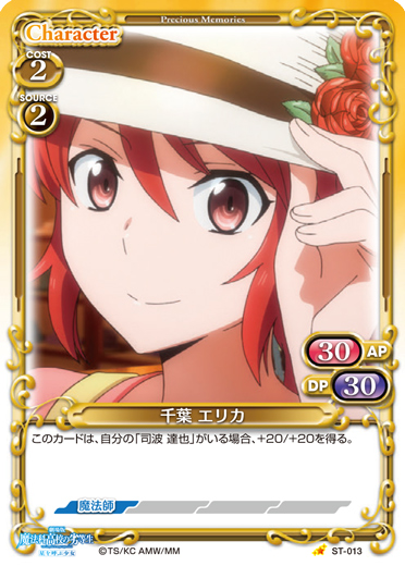 | [メイン/自分]:《休》自分の【魔法師】を持つキャラ1枚は、ターン終了時まで+20/±0を得る。(《休》:このキャラを休息状態にすることでテキストを使用することができる。) | ||