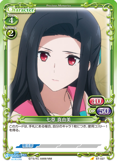 | [メイン/自分]:自分の捨て札置き場にある【魔法師】を持つキャラ1枚を手札に戻す。 | ||