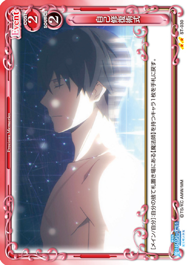 | [メイン/両方]:《休》自分の「光井 ほのか」1枚を活動状態にする。(《休》:このキャラを休息状態にすることでテキストを使用することができる。) | ||