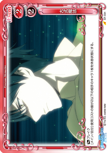 | 〔ブレイク〕[メイン/自分]:使用コストの値が2以下の相手のキャラ1枚を休息状態にする。 | ||