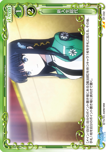 | [メイン/自分]:自分のポイント置き場にある【魔法師】を持つキャラ1枚を手札に加える。その後、手札1枚を自分のポイント置き場に表向きで置く。 | ||
