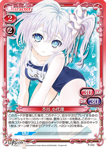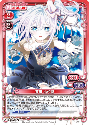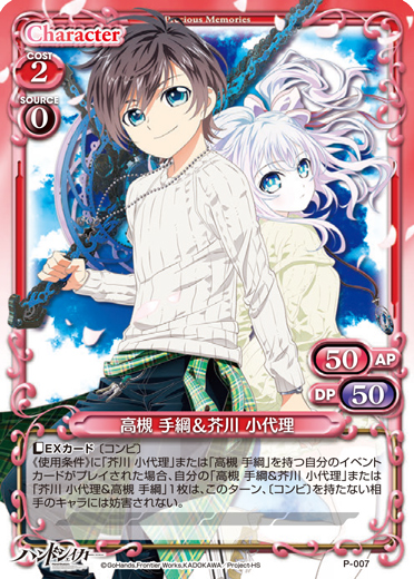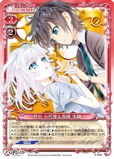 | 〔コンビ〕このカードが登場した場合、カードを2枚引く。[メイン/両方]:「芥川 小代理」▸キャラ1枚を活動状態にする。[メイン/自分]:「高槻 手綱」▸自分の捨て札置き場にある「芥川 小代理」1枚をサポートエリアに出す。 | ||