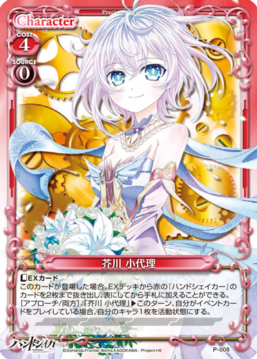 | 〔EXカード〕このカードが登場した場合、EXデッキから赤の『ハンドシェイカー』のカードを2枚まで抜き出し、表にしてから手札に加えることができる。[アプローチ/両方]:「芥川 小代理」▸このターン、自分がイベントカードをプレイしている場合、自分のキャラ1枚を活動状態にする。 | ||