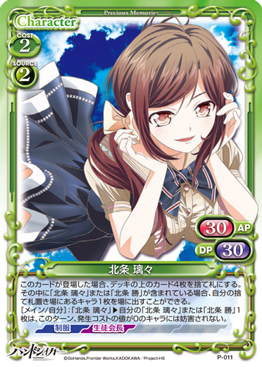 | このカードが登場した場合、このターン、自分が次にプレイする赤の『ハンドシェイカー』のカード1枚は、使用コスト-6を得る。このターン、使用コストの値が3以上の自分のキャラが登場した場合、自分のキャラ1枚は、ターン終了時まで〔アクティブ〕、+20/+20を得る。 | ||