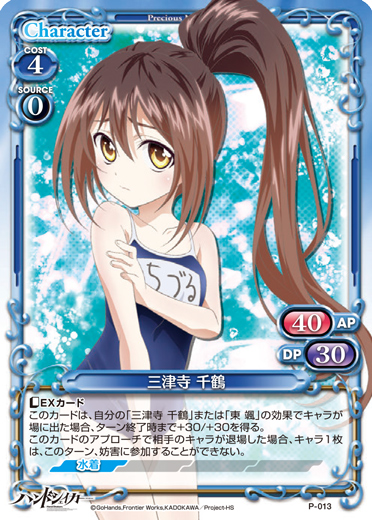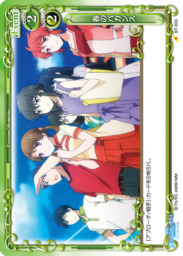 | 〔EXカード〕このカードは、自分の「三津寺 千鶴」または「東 颯」の効果でキャラが場に出た場合、ターン終了時まで+30/+30を得る。このカードのアプローチで相手のキャラが退場した場合、キャラ1枚は、このターン、妨害に参加することができない。 | ||