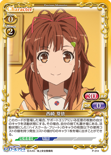| このカードが登場した場合、サポートエリアにいる任意の枚数の自分のキャラを活動状態にする。その場合、自分の捨て札置き場にある、活動状態にした『ハイスクール・フリート』のキャラの枚数以下の使用コストの値を持つ発生コストの値が0のキャラ1枚を場に出すことができる。 | ||