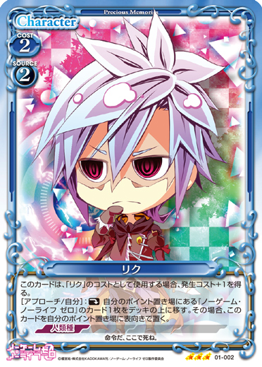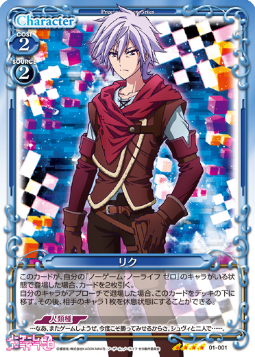 | このカードは、「リク」のコストとして使用する場合、発生コスト+1を得る。[アプローチ/自分]:《休》自分のポイント置き場にある『ノーゲーム・ノーライフ ゼロ』のカード1枚をデッキの上に移す。その場合、このカードを自分のポイント置き場に表向きで置く。 | ||