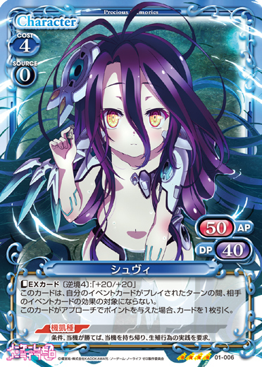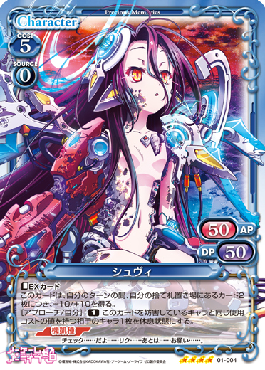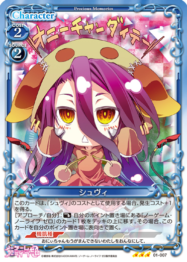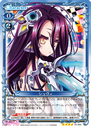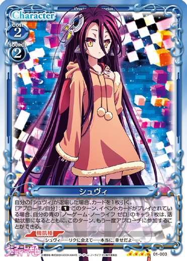 | このカードは、「シュヴィ」のコストとして使用する場合、発生コスト+1を得る。[アプローチ/自分]:《休》自分のポイント置き場にある『ノーゲーム・ノーライフ ゼロ』のカード1枚をデッキの上に移す。その場合、このカードを自分のポイント置き場に表向きで置く。 | ||