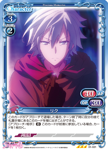 | このカードがアプローチで退場した場合、自分のキャラ1枚は、ターン終了時まで+30/+30を得る。 | ||