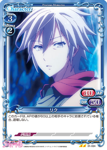 | このカードは、自分のターンの間、自分の「リク」がいる場合、+40/±0を得る。このカードは、相手のターンの間、自分の「リク」がいる場合、相手の効果では休息状態にならない。 | ||