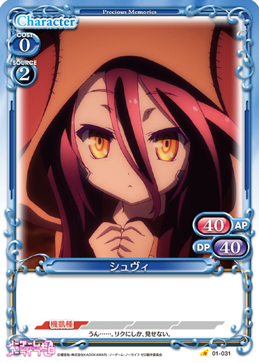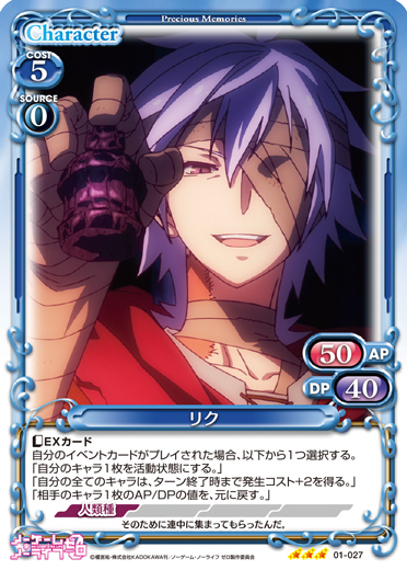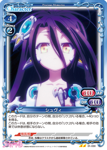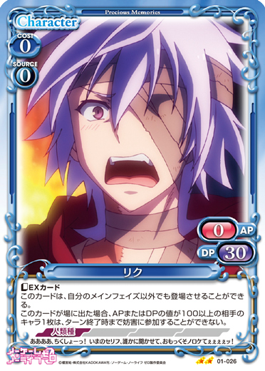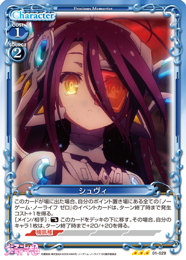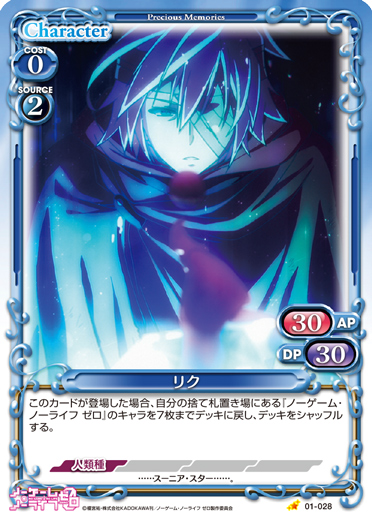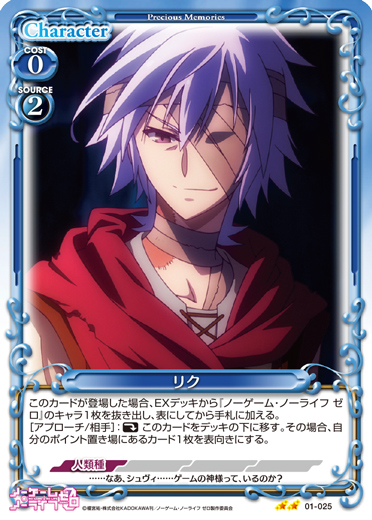 | このカードが登場した場合、EXデッキから『ノーゲーム・ノーライフ ゼロ』のキャラ1枚を抜き出し、表にしてから手札に加える。[アプローチ/相手]:《休》このカードをデッキの下に移す。その場合、自分のポイント置き場にあるカード1枚を表向きにする。 | ||