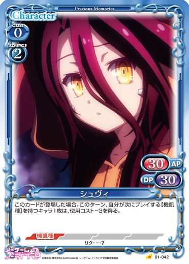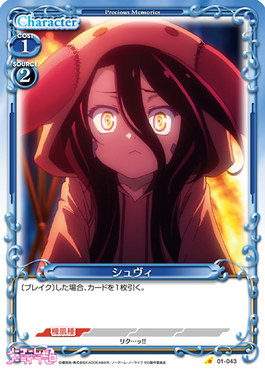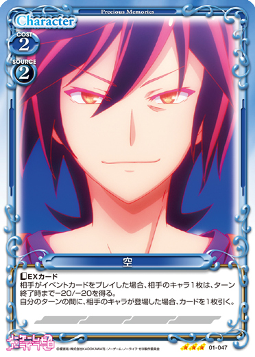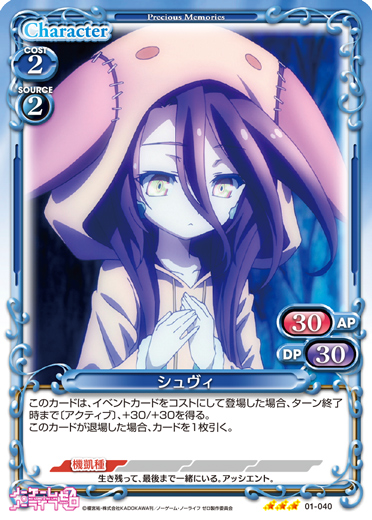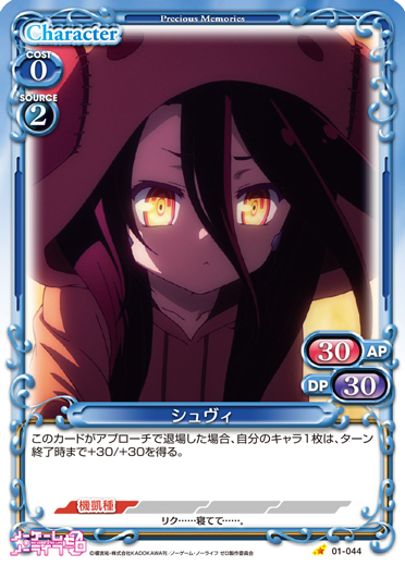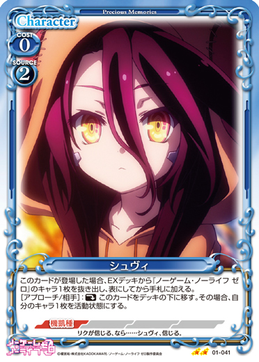 | このカードが登場した場合、EXデッキから『ノーゲーム・ノーライフ ゼロ』のキャラ1枚を抜き出し、表にしてから手札に加える。[アプローチ/相手]:《休》このカードをデッキの下に移す。その場合、自分のキャラ1枚を活動状態にする。 | ||