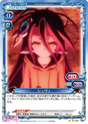 | このカードが登場した場合、自分の捨て札置き場にある『ノーゲーム・ノーライフ ゼロ』のキャラを7枚までデッキに戻し、デッキをシャッフルする。 | ||