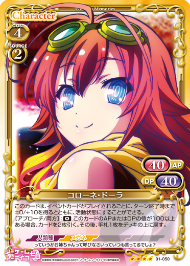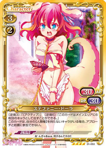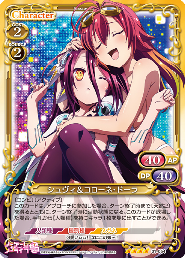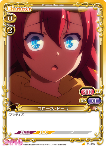 | このカードは、「コローネ・ドーラ」または「ステファニー・ドーラ」のコストとして使用する場合、発生コスト+1を得る。[メイン/両方]:《休》このカードを手札に戻す。その場合、自分の『ノーゲーム・ノーライフ ゼロ』のキャラ1枚をゲームから取り除く。その後、そのキャラを場に出す。 | ||