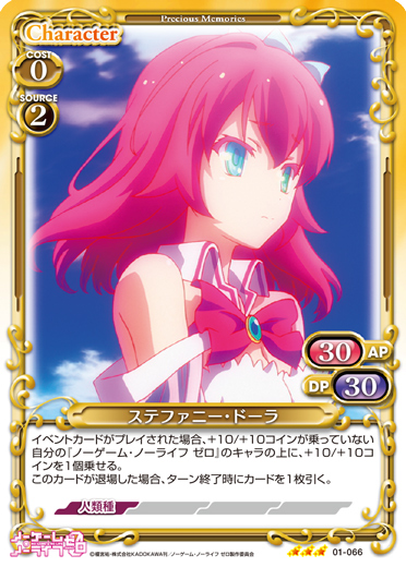 | イベントカードがプレイされた場合、+10/+10コインが乗っていない自分の『ノーゲーム・ノーライフ ゼロ』のキャラの上に、+10/+10コインを1個乗せる。このカードが退場した場合、ターン終了時にカードを1枚引く。 | ||