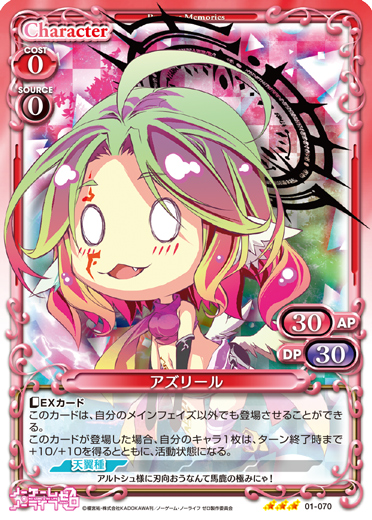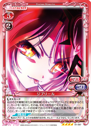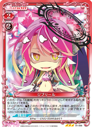 | このカードは、【天翼種】を持つキャラのコストとして使用する場合、発生コスト+1を得る。[メイン/両方]:《休》このカードを手札に戻す。その場合、自分の『ノーゲーム・ノーライフ ゼロ』のキャラ2枚は、ターン終了時まで+20/+20を得る。 | ||