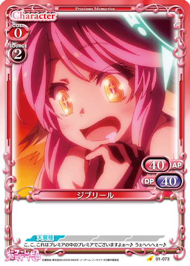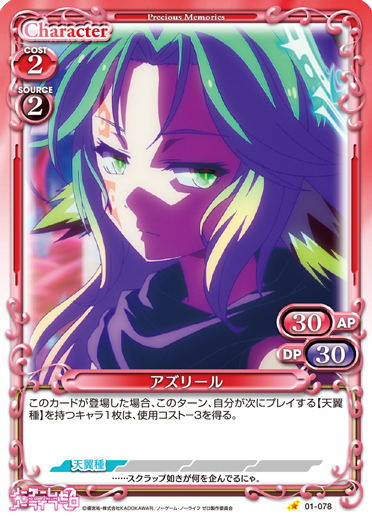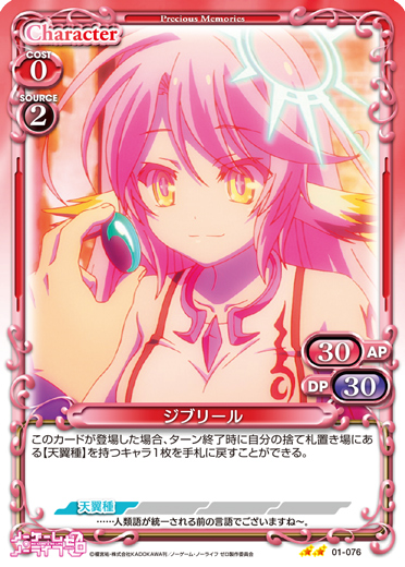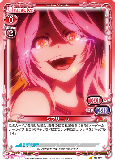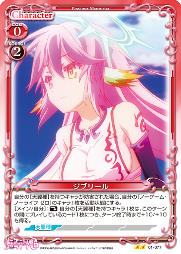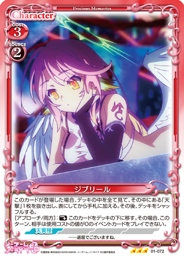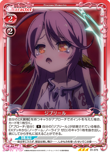 | 自分の【天翼種】を持つキャラがアプローチでポイントを与えた場合、カードを1枚引く。[アプローチ/自分]:《1》自分の「ジブリール」が妨害されている場合、EXデッキから『ノーゲーム・ノーライフ ゼロ』のキャラ1枚を抜き出し、表にしてから手札に加えることができる。 | ||