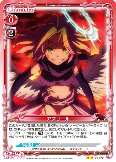 | 自分の【天翼種】を持つキャラが妨害された場合、自分の『ノーゲーム・ノーライフ ゼロ』のキャラ1枚を活動状態にする。[メイン/自分]:《休》自分の【天翼種】を持つキャラ1枚は、このターンの間にプレイしているカード1枚につき、ターン終了時まで+10/+10を得る。 | ||