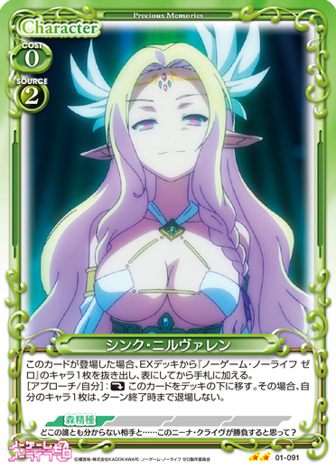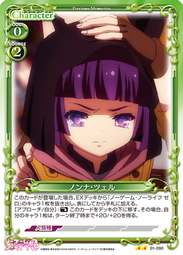 | このカードが登場した場合、EXデッキから『ノーゲーム・ノーライフ ゼロ』のキャラ1枚を抜き出し、表にしてから手札に加える。[アプローチ/自分]:《休》このカードをデッキの下に移す。その場合、自分のキャラ1枚は、ターン終了時まで退場しない。 | ||