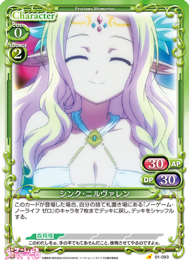 | このカードが登場した場合、自分の捨て札置き場にある『ノーゲーム・ノーライフ ゼロ』のキャラを7枚までデッキに戻し、デッキをシャッフルする。 | ||