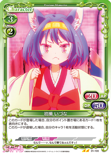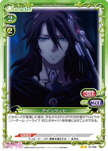 | このカードが登場した場合、手札からAPとDPの合計値が70以下の『ノーゲーム・ノーライフ ゼロ』のキャラ1枚を場に出すことができる。 | ||