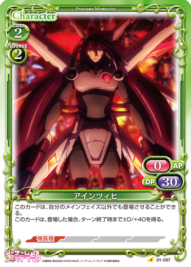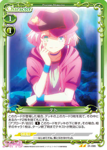 | このカードが登場した場合、自分のポイント置き場にあるカード1枚を表向きにする。このカードが退場した場合、自分のキャラ1枚を活動状態にする。 | ||
