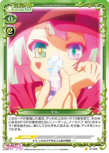 | このカードが登場した場合、デッキの上のカード10枚を見て、その中にあるAP/DPの値を持たない『ノーゲーム・ノーライフ ゼロ』のキャラ1枚を抜き出し、表にしてから手札に加える。その後、デッキをシャッフルする。 | ||