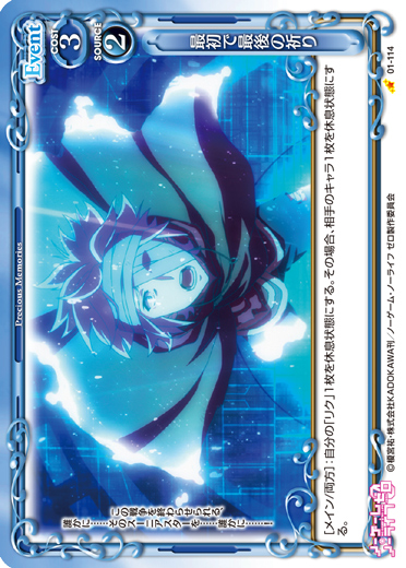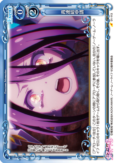 | [アプローチ/自分]:このターンの間にアプローチに参加していない、自分の『ノーゲーム・ノーライフ ゼロ』のキャラ1枚をゲームから取り除く。その後、そのキャラを場に出す。 | ||