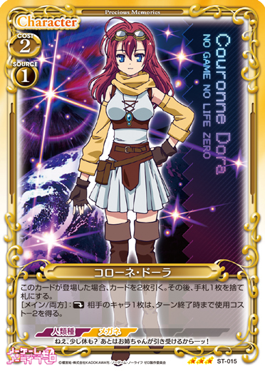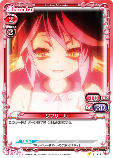 | [メイン/両方]:《休》自分の『ノーゲーム・ノーライフ ゼロ』のキャラ1枚は、ターン終了時まで±0/+20を得る。(《休》:このキャラを休息状態にすることでテキストを使用することができる。) | ||