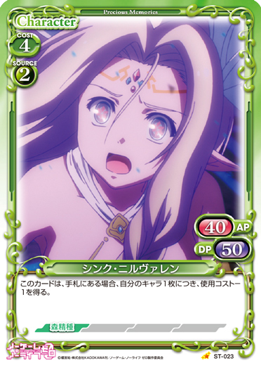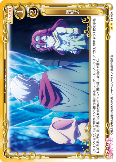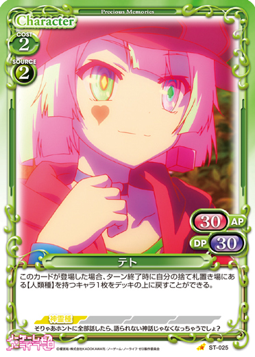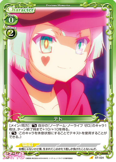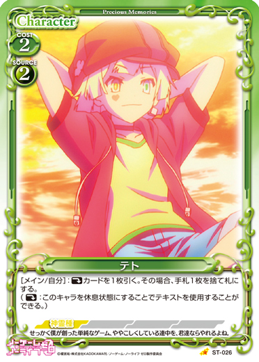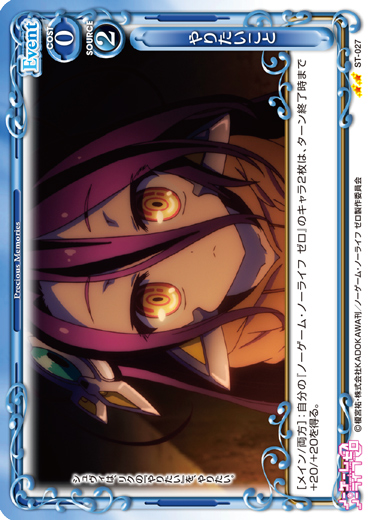 | [メイン/自分]:自分のポイント置き場にある『ノーゲーム・ノーライフ ゼロ』のキャラ1枚を手札に加える。その後、手札1枚を自分のポイント置き場に表向きで置く。 | ||