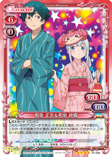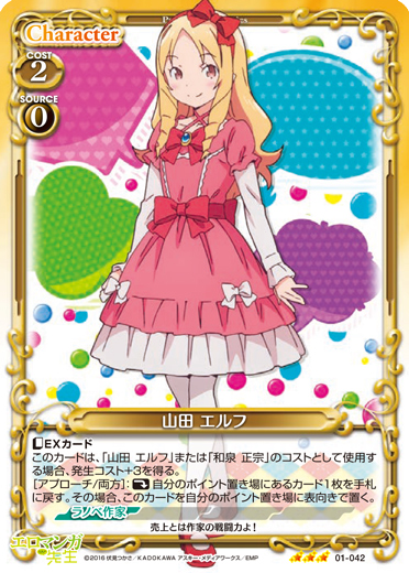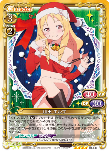 | 〔EXカード〕 〔アクティブ〕このカードは、自分の「山田 エルフ」または「和泉 正宗」がアプローチに参加するごとに、ターン終了時まで+30/+30を得る。全ての自分の【ラノベ作家】を持つキャラは、自分の手札の枚数が0枚の場合、ターン終了時に活動状態になる。 | ||