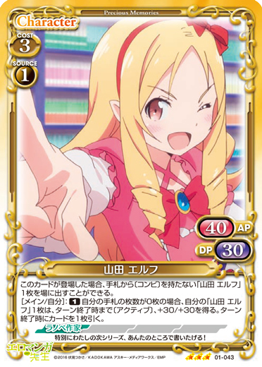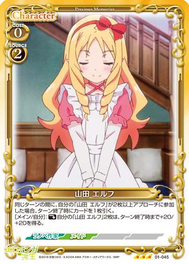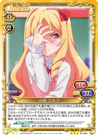 | 同じターンの間に、自分の「山田 エルフ」が2枚以上アプローチに参加した場合、ターン終了時にカードを1枚引く。[メイン/自分]:《休》自分の「山田 エルフ」2枚は、ターン終了時まで+20/+20を得る。 | ||