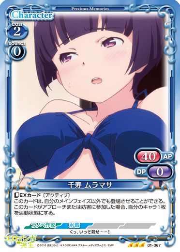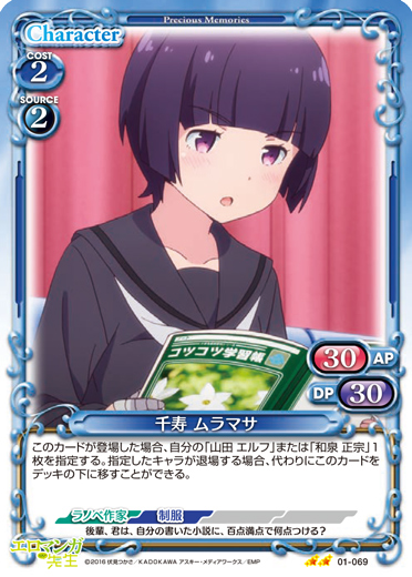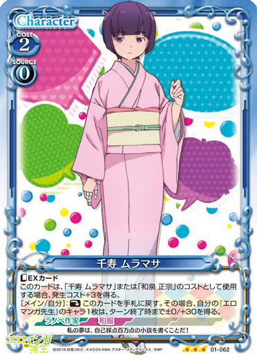 | 〔EXカード〕このカードは、「千寿 ムラマサ」または「和泉 正宗」のコストとして使用する場合、発生コスト+3を得る。[メイン/自分]:《休》このカードを手札に戻す。その場合、自分の『エロマンガ先生』のキャラ1枚は、ターン終了時まで±0/+30を得る。 | ||